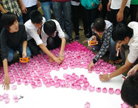 | Các sinh viên đính bông sen có ghi lời tri ân lên tấm thiệp. Ảnh: H.Y. |