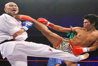 | Vua quyền anh Thái Lan Kaoklai Kaennorsing trong một trận so găng với đối thủ trên sàn đấu. |