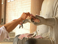 | Bàn tay của vị La Hán này dù rất to lớn, nhưng cũng chẳng thể nhận hết tiền lẻ "hối lộ" của chúng sinh |