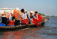 Du khách đổ cá, ốc xuống sông với hi vọng những sinh vật này sẽ tự do và người phóng sinh sẽ được phước lành - Ảnh: Mai Vinh