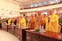 Sớm chót thu 28/10, trước cửa Nhà hát lớn 3-2 tỉnh Nam Định, đối diện với quảng trường Hưng Đạo Đại Vương đông nghịt tăng, ni, phật tử cùng thấp thoáng những sư thày bận áo màu vàng, màu thâm. Nếu ai đó nghĩ rằng, đến với Phật giáo là không còn vướng bận bụi trần thì quả thật chẳng phải. Bởi tâm hướng của Phật luôn quan ý đến chúng sinh, mong cho người dân có được cuộc sống an lạc, hạnh phúc. Đức Phật dạy rằng: “Phật pháp tại thế gian, bất ly thế gian giác”.
