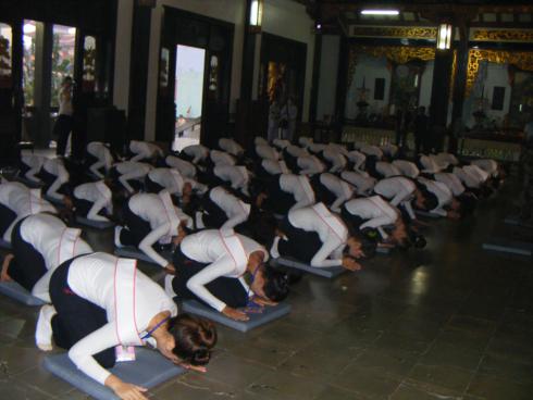 Tại khuôn viên bên trong chánh điện - Sư cô Thích Nữ Hương Nhũ rất tận tình nhiệt tâm hướng dẫn các thí sinh từ những điều cơ bản nhất - thắp nhang - lễ lậy Phật - chắp tay - qùy - ngồi thiền bán già - kiết già.