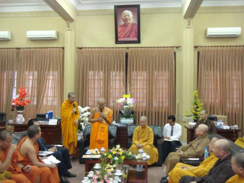 Ngài Đại Tăng Thống cũng rất cảm kích về GHPGVN đã dành cho đoàn một sự đón tiếp với những tình cảm hết sức nồng hậu. Nhân dịp này, Ngài cũng bày tỏ sự biết ơn sâu sắc đến những tình cảm mà Việt Nam đã dành tặng cho đất nước Campuchia trong suốt chặng đường phát triển của đất nước. Ngài Đại Tăng Thống đã nhấn mạnh“Sự hòa hợp, tình hữu nghị giữa hai quốc gia và Phật giáo hai nước là điều kiện quan trọng đem lại sự an lạc chung cho nhân dân Campuchia và Việt Nam”.