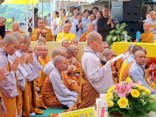 Kế đến, ĐĐ. Thích Minh Nhựt đại diện Giới tửTăng và sư cô TN.Diệu Hạnh đại diện Giới tử Ni đọc Cung an Chức sựtheo nghi lễ cổ truyền tại Lễ Khai Mạc Đại GiớiĐàn.